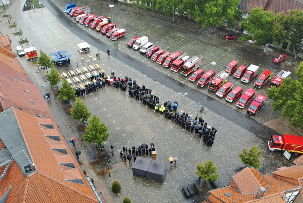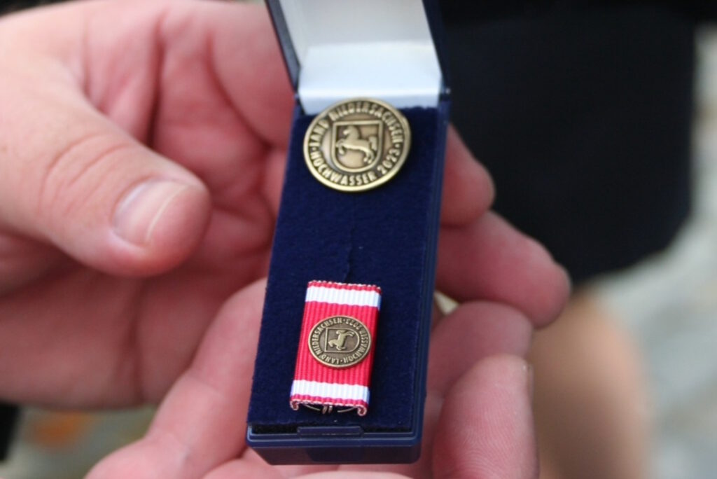 Die Einsatzkräfte aus dem Landkreis Helmstedt wurden im Rahmen einer Feierstunde auf dem Holzberg in Helmstedt für ihren Einsatz während der Weihnachtsflut 2023 geehrt. Insbesondere Kräfte der Feuerwehr, des THW und des DRK waren dabei stark vertreten. Sie alle erhielten bei strömendem Regen das Ehrenzeichen des Landes Niedersachsen. Der Grund der späten Ehrung lag in der notwendigen europaweiten Ausschreibung zur Fertigung der Ehrenzeichen und Ehrennadel.