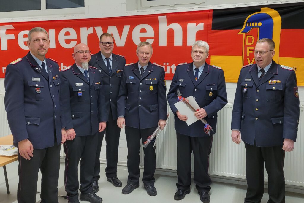 Karsten Dierking (3.v.r.) und Ralf Holste (2.v.r.) werden für 50 Jahre aktive Dienste mit dem Ehrenzeichen des Landes Niedersachsen ausgezeichnet. Mit im Bild: Stadtbrandmeister Christian Kahl (links), OrtsBM Manuel Schrader (2.v.l.), Stellv. OrtsBM Henrik Bangemann (3.v.l.) und Abschnittsleiter Nord Stefan Müller (rechts)