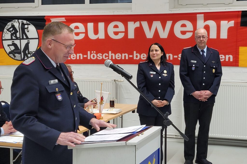Zum Tagesordnungspunkt Ehrungen gab es gleich mehrere bemerkenswerte Auszeichnungen. Abschnittsleiter Nord Stefan Müller hatte die ehrenvolle Aufgabe, die Kameraden Karsten Dierking und Ralf Holste für 50 Jahre aktive Dienste auszuzeichnen. Beide sind in den 70er Jahren in die 1973 gegründete Jugendfeuerwehr eingetreten und sind noch immer in der Einsatzabteilung. Beide erhielten nun das Feuerwehrehrenzeichen des Landes Niedersachsen. Der ehemals aktive Kamerad Rüdiger Schrader blickt ebenfalls auf eine 50-jährige Mitgliedschaft zurück und erhielt dafür das Abzeichen des Landesfeuerwehrverbandes Niedersachsen. Besondere Auszeichnungen erhielten außerdem die aktiven Mitglieder Jacqueline Balzereit und Michael Kauth. Beide sind neben ihren Tätigkeiten in der Ortsfeuerwehr (Gruppenführerin/Zugführer) auch seit Jahren in der Feuerwehr Kreisausbildung des Landkreises Helmstedt tätig. Abschnittsleiter Stefan Müller überreichte ihnen dafür die Ehrennadel des Kreisfeuerwehrverbandes Helmstedt (Jacqueline Balzereit in Bronze – Michael Kauth in Silber).