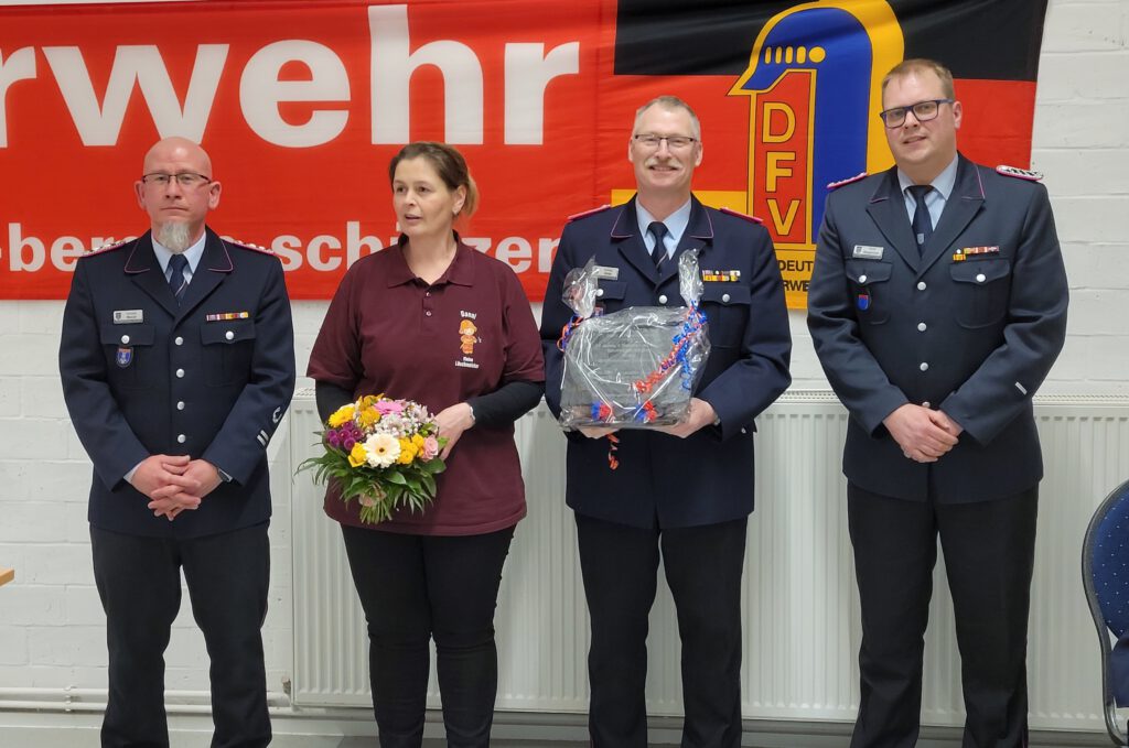 Zum Abschluss der Versammlung hatte Ortsbrandmeister Manuel Schrader noch die ehrenvolle Aufgabe, dem bisherigen Ortsbrandmeister Matthias Müller und seiner Frau Daniela Müller großen Dank zu sagen. Dank an Matthias für über 26 Jahre Kommandotätigkeit und Dank an Daniela, dass sie stets hinter ihm stand und den „Rücken freigehalten und gestärkt“ hat. Unter lang anhaltendem Beifall nahmen beide ein kleines Präsent und Blumen entgegen.