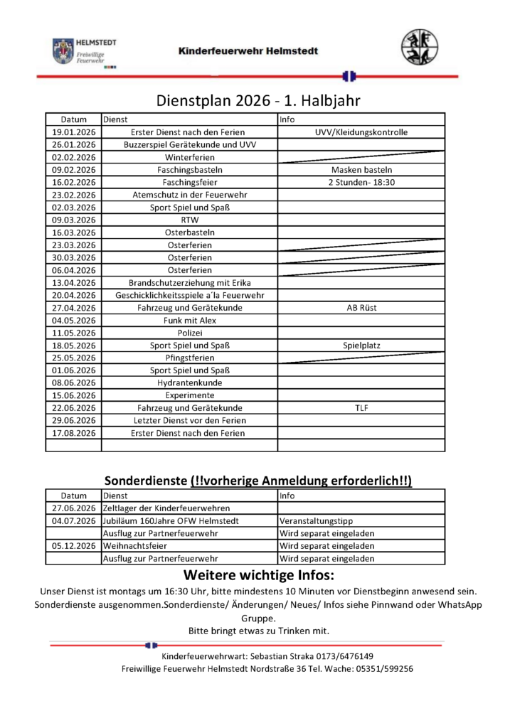Wir treffen uns immer Montags in der Feuerwehr (außer in den Ferien). Dienstzeit ist von 16:30 Uhr bis 17:30 Uhr. Du findest uns in der Nordstraße 36 in Helmstedt